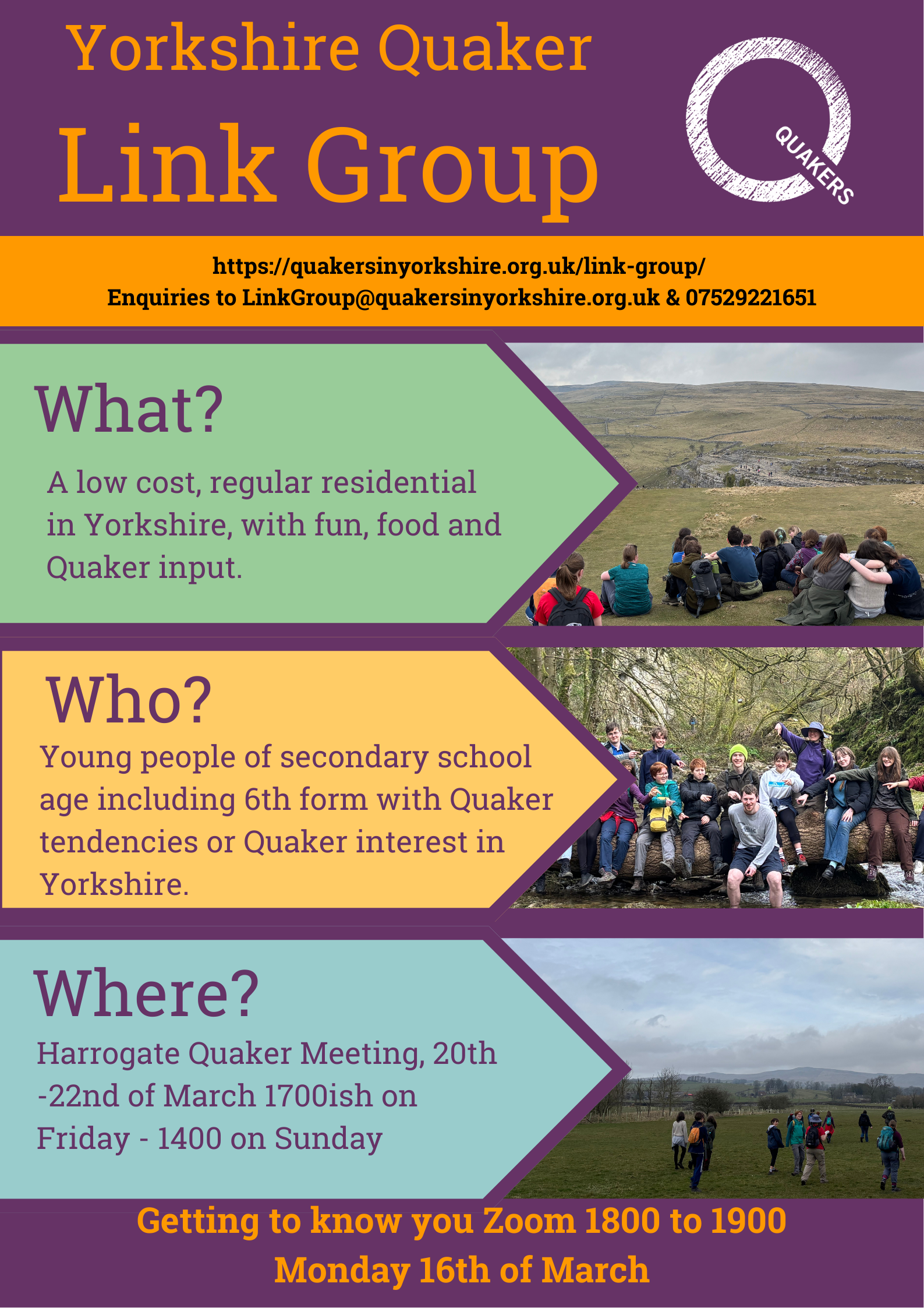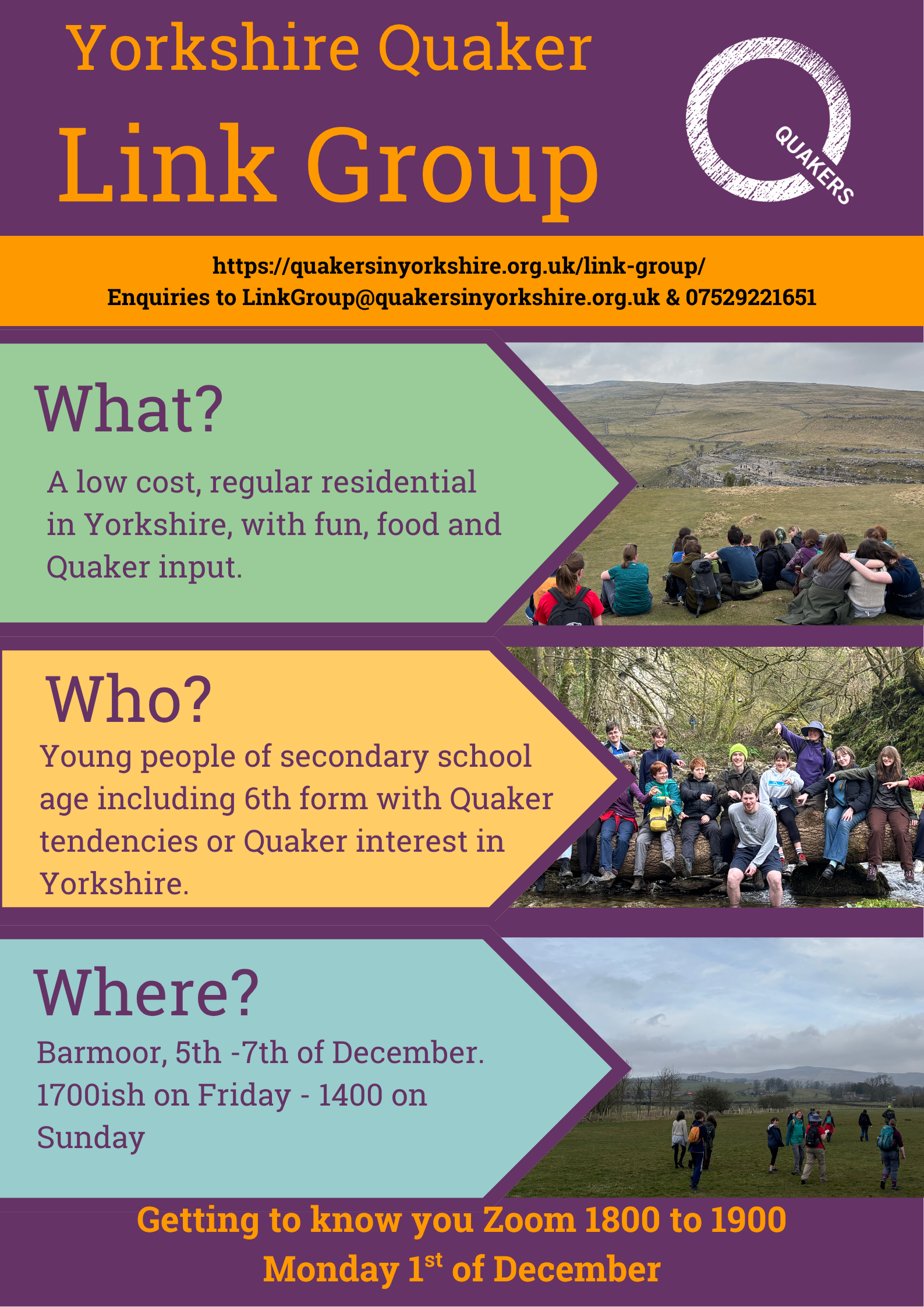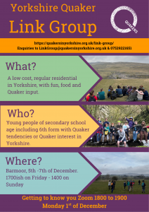 Something is needed to link up these experiences and keep friendships and relationships ticking between them. That’s where link group comes in… a single night, cheap-as-chips residentials that roves around Yorkshire linking up young people, events and Quaker communities. Link group is a mostly social, but distinctively Quaker get-together to which any 11-18’s with a Quaker interest can come.