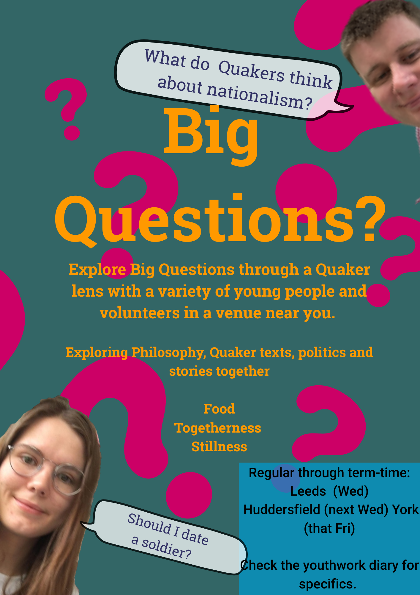 - Big Questions? Various times and in variety of locations and ways, but often in school holidays, Big Questions? is a space in which young people can explore some of the Life the Universe and Everything, type quandaries in a participatory, co-created environment.